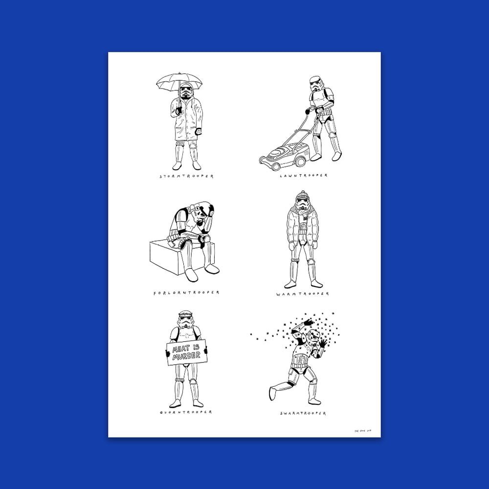 A nice A3 print featuring six illustrated puns about the Galactic Empire's faceless foot-soldiers. Including Warmtrooper, Forlorntrooper and the ever-popular Quorntrooper.